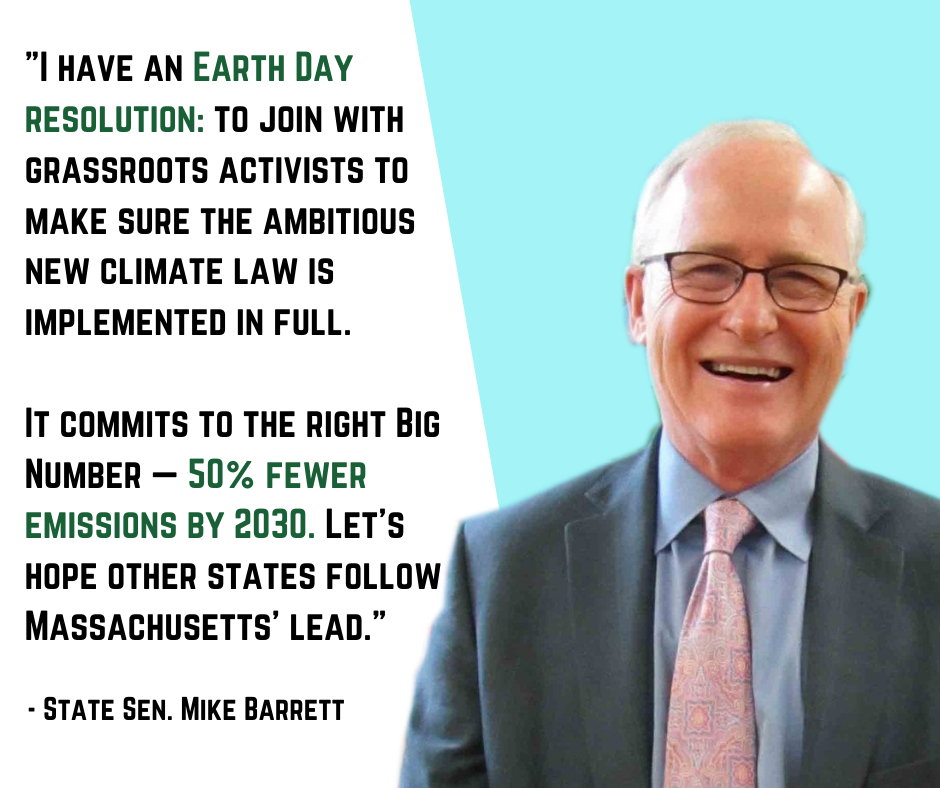 I have an Earth Day resolution: to join with grassroots activists to make sure the ambitious new climate law is implemented in full. It commits to the right Big Number — 50% fewer emissions by 2030. Let’s hope other states follow Massachusetts’ lead.