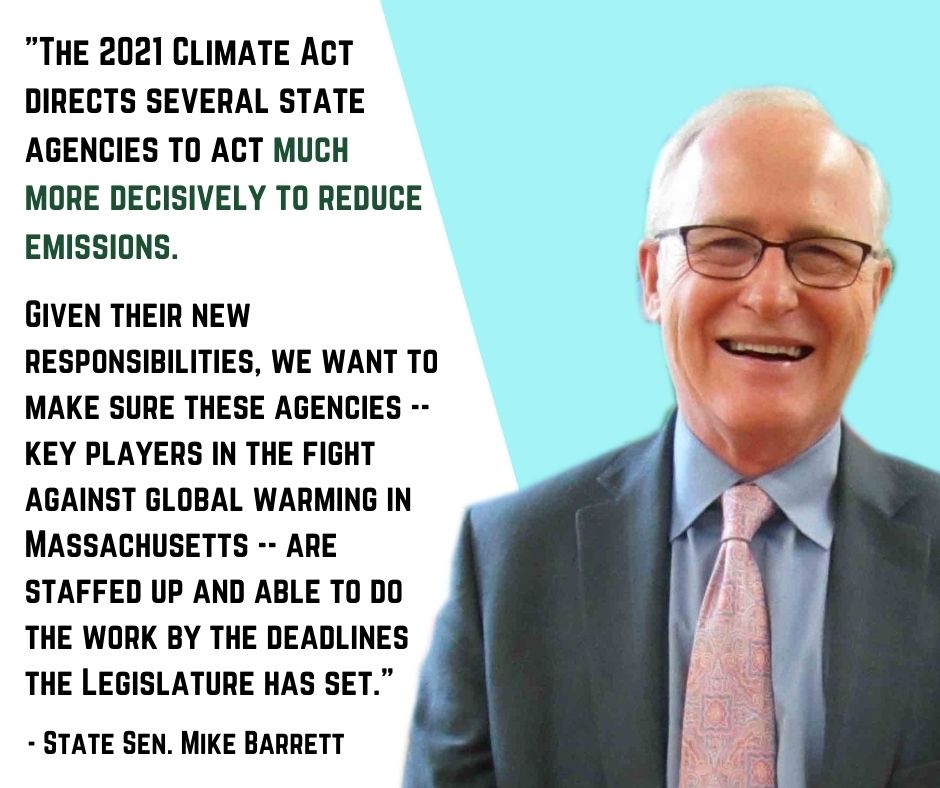 The Massachusetts Senate approved my amendment to add additional staff to the Executive Office of Energy and Environmental Affairs. The funds will allow for the hiring of two full-time employees at EEA to work on the implementation of the NextGen climate statute.