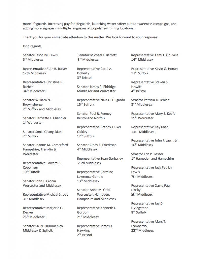 Learning how to swim should be a critical life skill available to everyone. Rather than pursuing swimming bans or draconian fines, we urge DCR and the Baker Administration to immediately expand efforts statewide that will improve water safety and help prevent future tragic drownings.