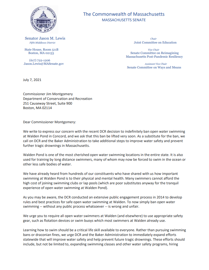 Just sent off to Dept. of Conservation and Recreation calling for the ban on open swimming at Walden Pond to be rescinded. From Senator Jason Lewis, me, and a bipartisan group of 48 additional legislators.