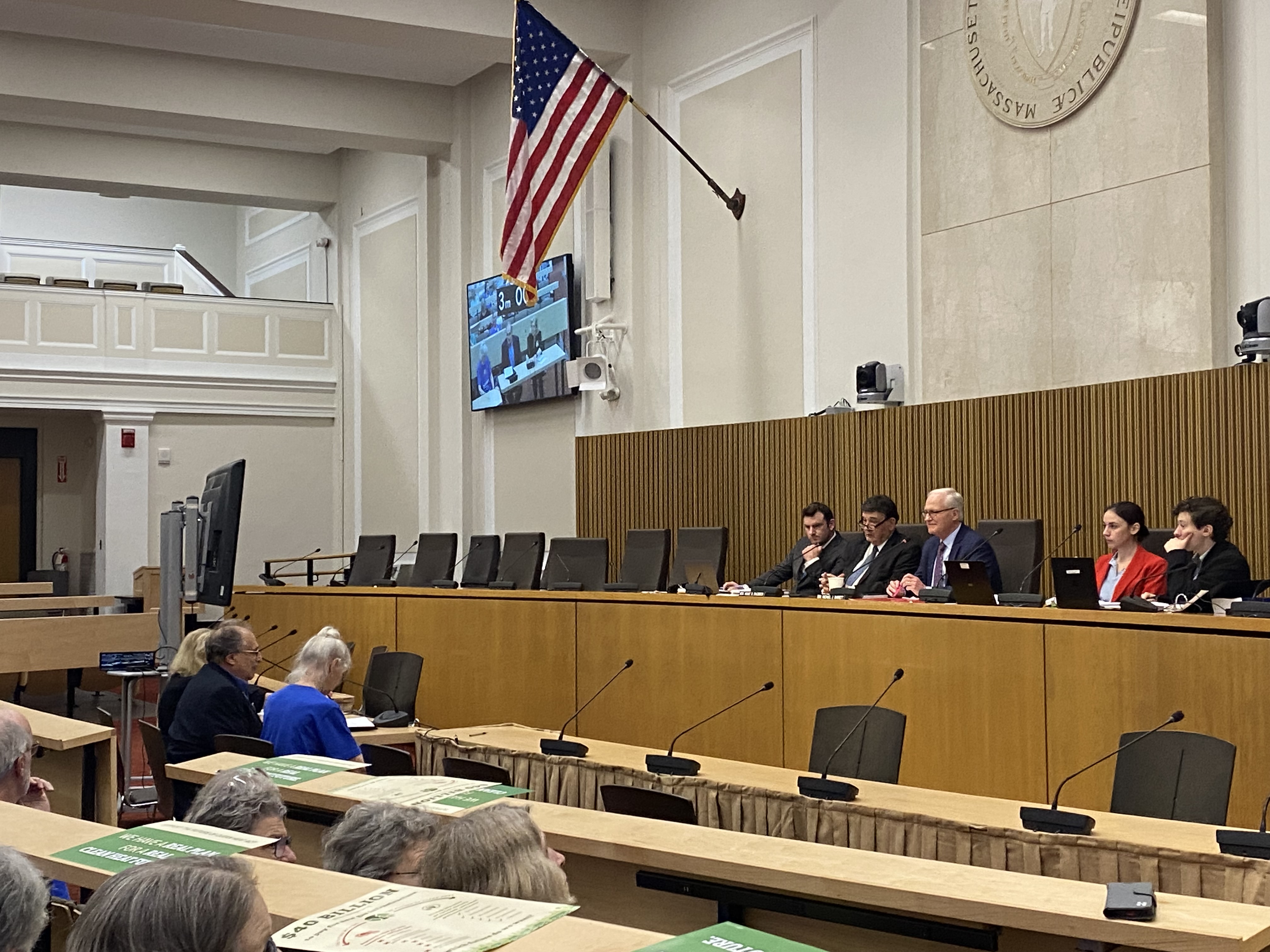 Senator Barrett listening to a panel of speakers testify at the Energy Committee hearing on decarbonization.