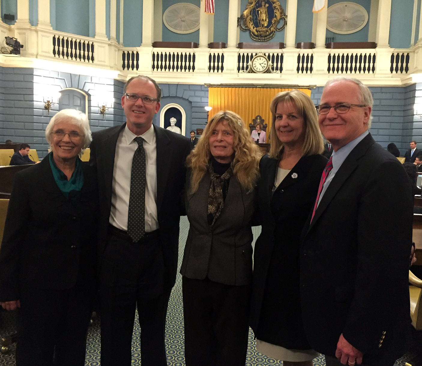 In 1966 Roberta “Bobbi” Gibb became the first woman to finish the Boston Marathon. The rules restricted the competition to men, but Bobbi jumped in at the starting line to join the male runners. She completed the course in an impressive 3 hours and 21 minutes. To mark the 50th anniversary of her trail-blazing, the State Senate honored her. Here, with Sen. Jehlen, Sen. Lewis, our honoree, and Sen. Lovely.