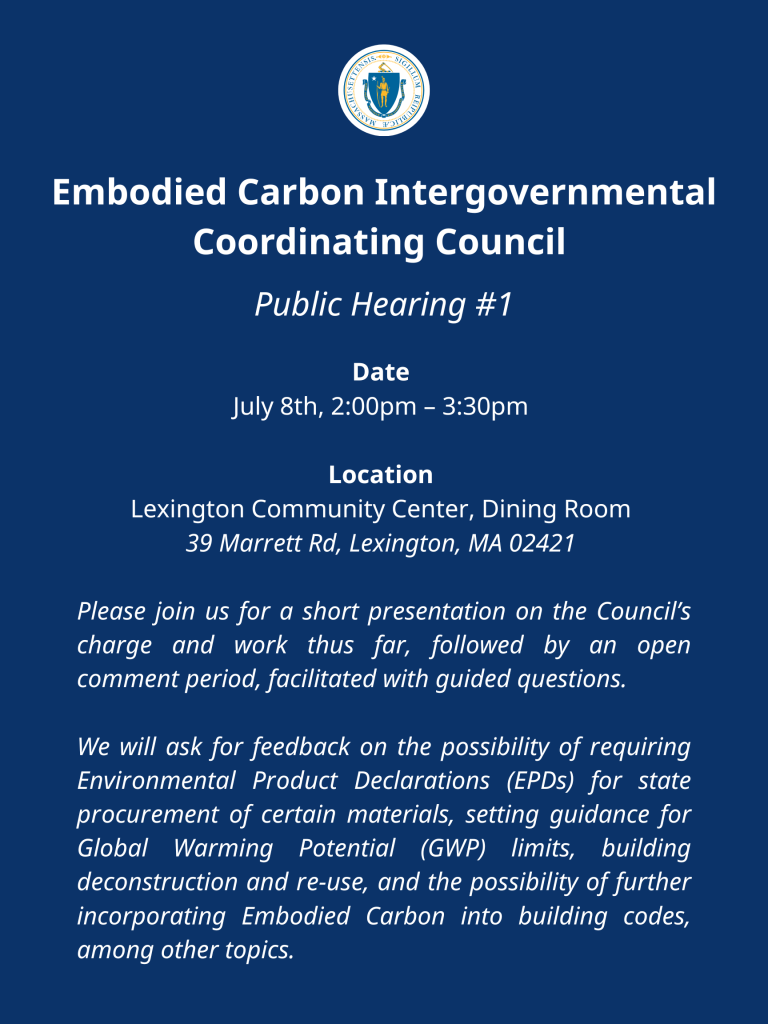 Next Tuesday in Lexington: The Embodied Carbon Council, which I serve on, is holding its first public hearing. The group was created by the Legislature in last year’s climate law to find ways to reduce the lifetime carbon emissions of state-owned buildings. During the hearing, the Council will share some early findings and invite feedback from the public.